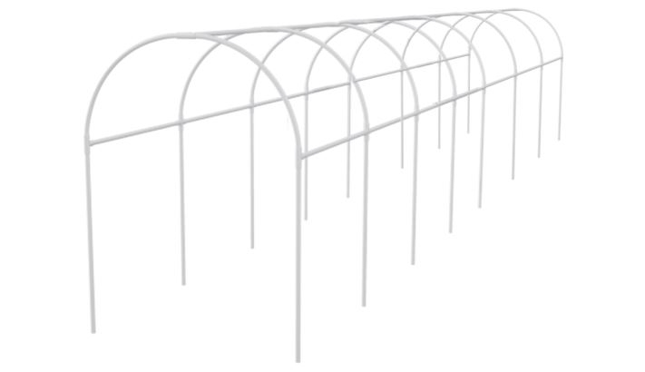Самый простой и быстрый в сборке вариант. Конструкция элементарна: дуги вставляют в землю с интервалом примерно 1,5 м, сверху покрывают пленкой или укрывным материалом, закрепляя края камнями или досками.