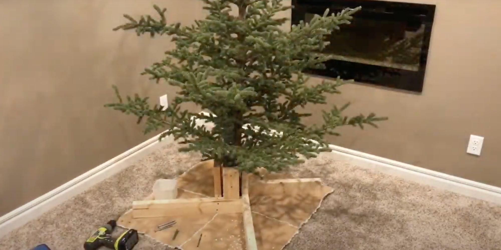 Поместите ёлку в подставку. Закрепите дерево саморезами.