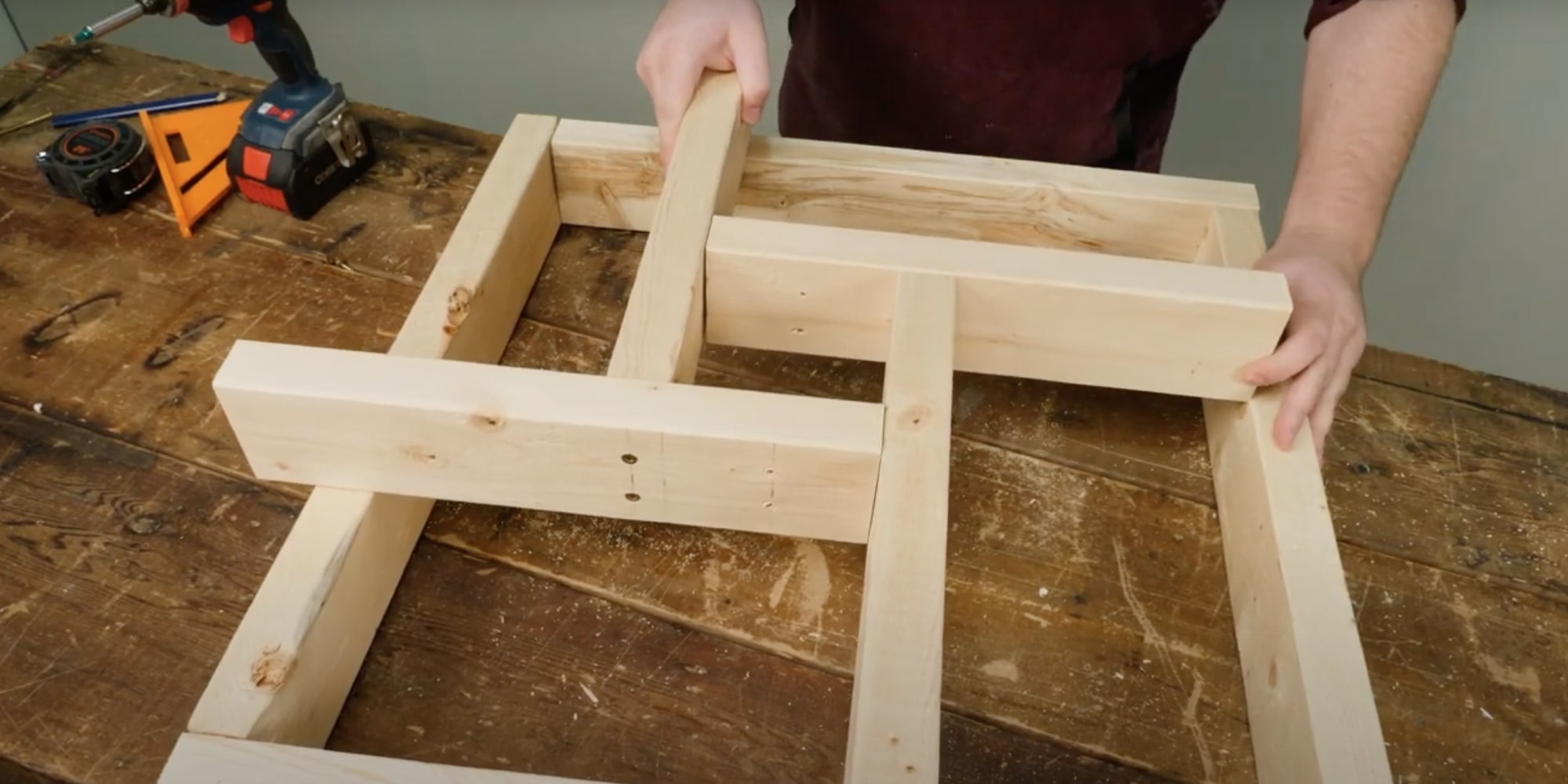 Крестовину необходимо прикрепить к рамке, вкрутив саморезы под углом 45 градусов с помощью отвёртки или дрели.