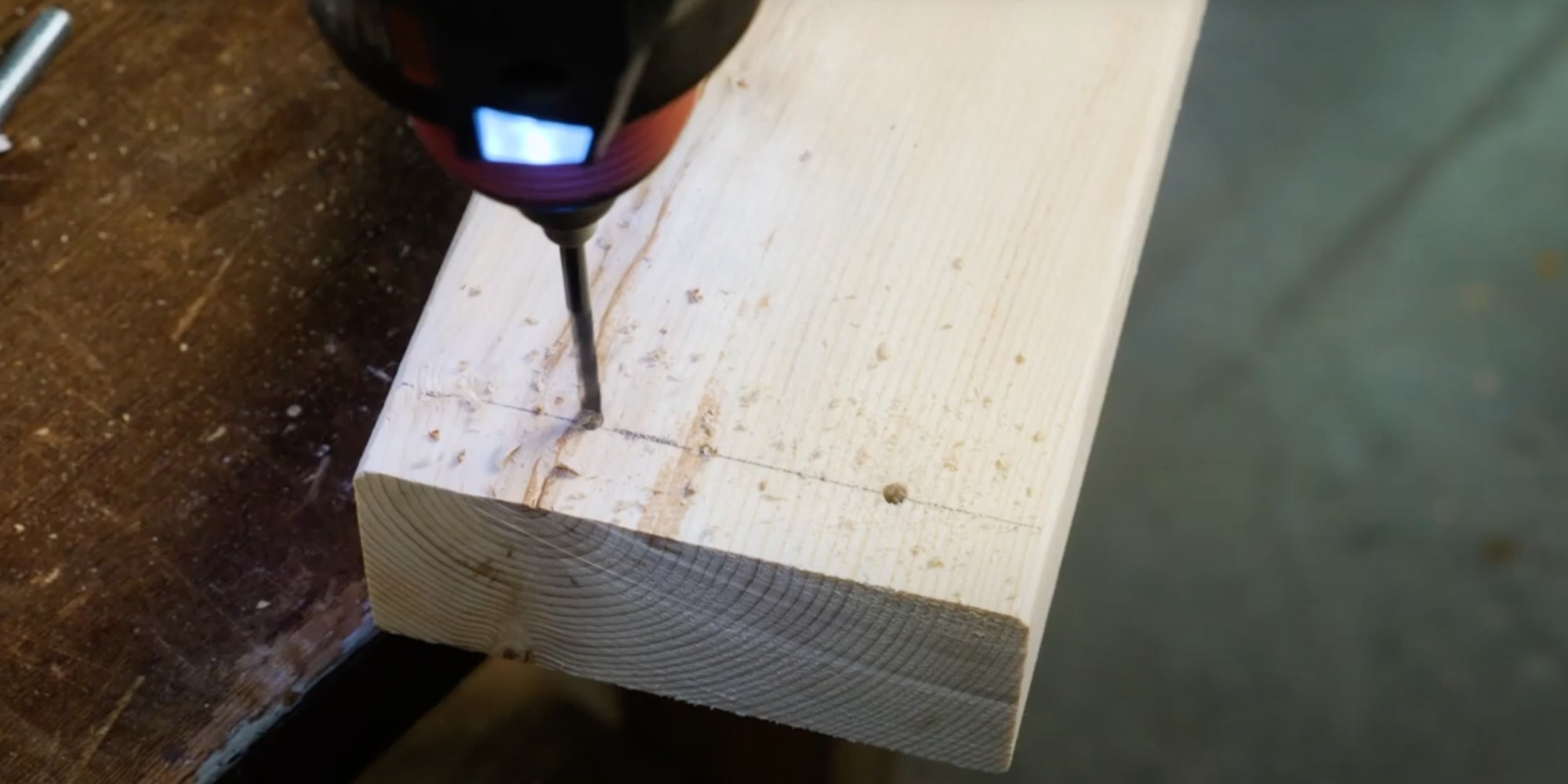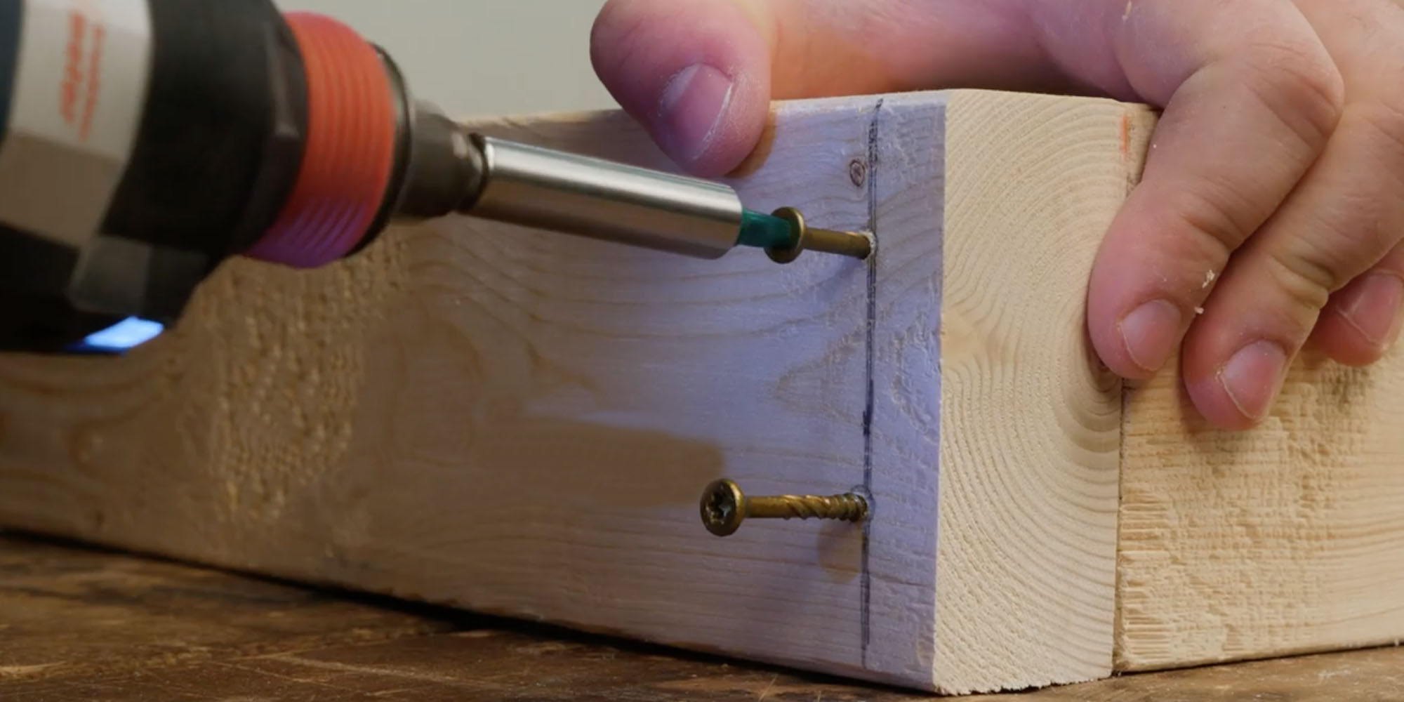 На оставшихся досках отметьте две линии: одну на расстоянии 8 см, а вторую — 16 см от одного из торцов. На каждой из этих линий просверлите по два отверстия. Саморезы в отверстия, расположенные ближе к центру досок, вкрутите не до конца.