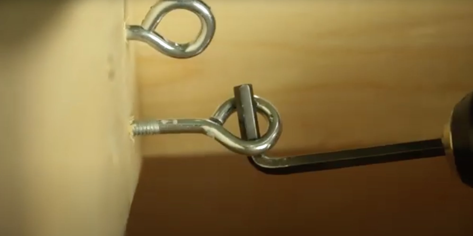 Установите ёлку в подставку и отрегулируйте угол её наклона. Зафиксируйте дерево, вкрутив в оставшиеся отверстия саморезы с кольцом (или обычные длинные саморезы) с помощью шуруповёрта. Для этого используйте шестигранный ключ, зажатый в патроне шуруповёрта, или крестовую биту.